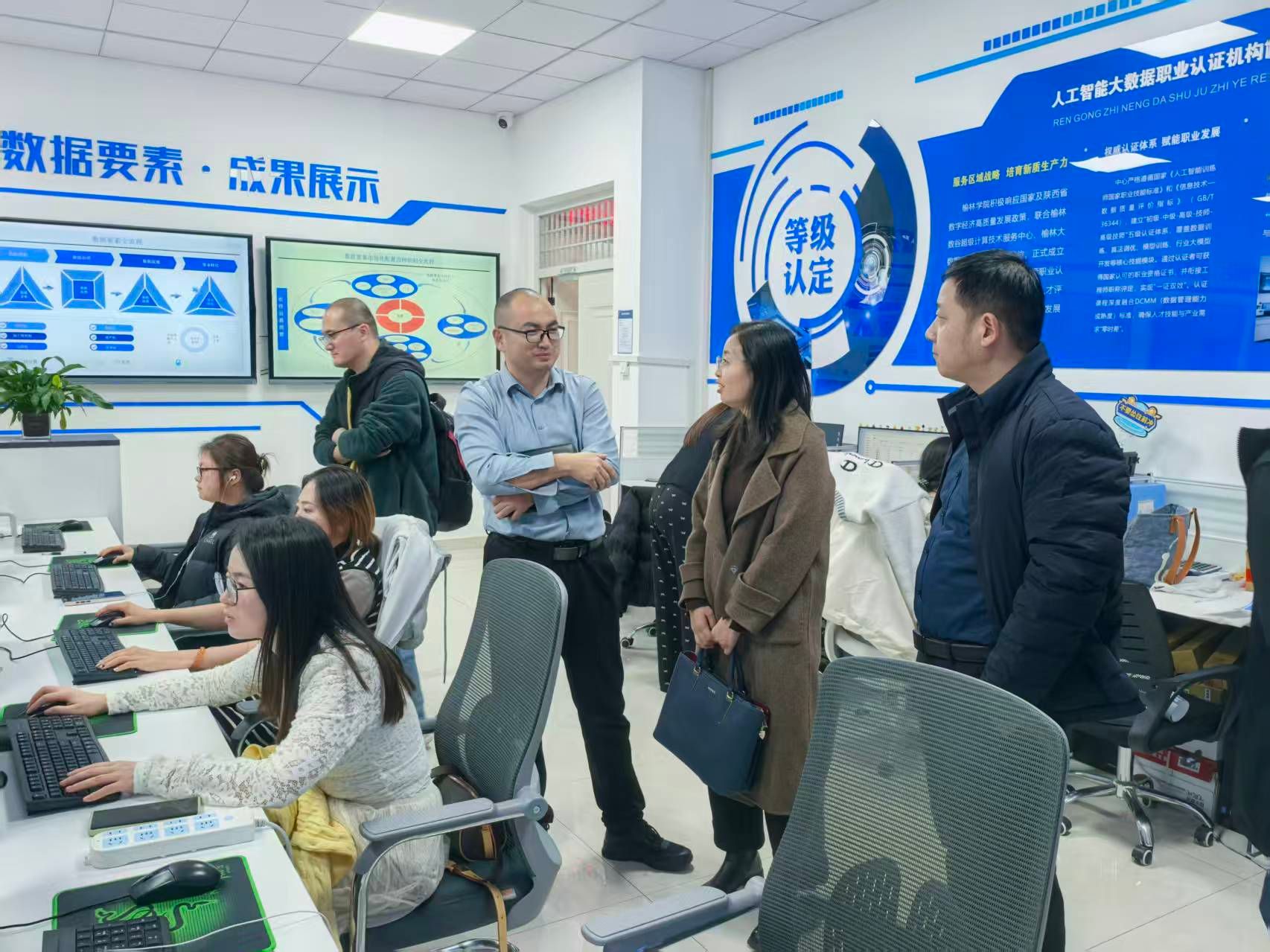 座谈会后,张伟一行实地参观了榆林学院人工智能产业学院实训中心、训练中心、研发中心、成果展示区和数字化考试与培训中心。通过现场观摩、技术交流等方式,调研团队详细了解了榆林学院在人工智能与大数据融合创新、产业学院建设、科研成果转化等方面的工作进展,为我院相关工作的优化升级提供了有益参考。