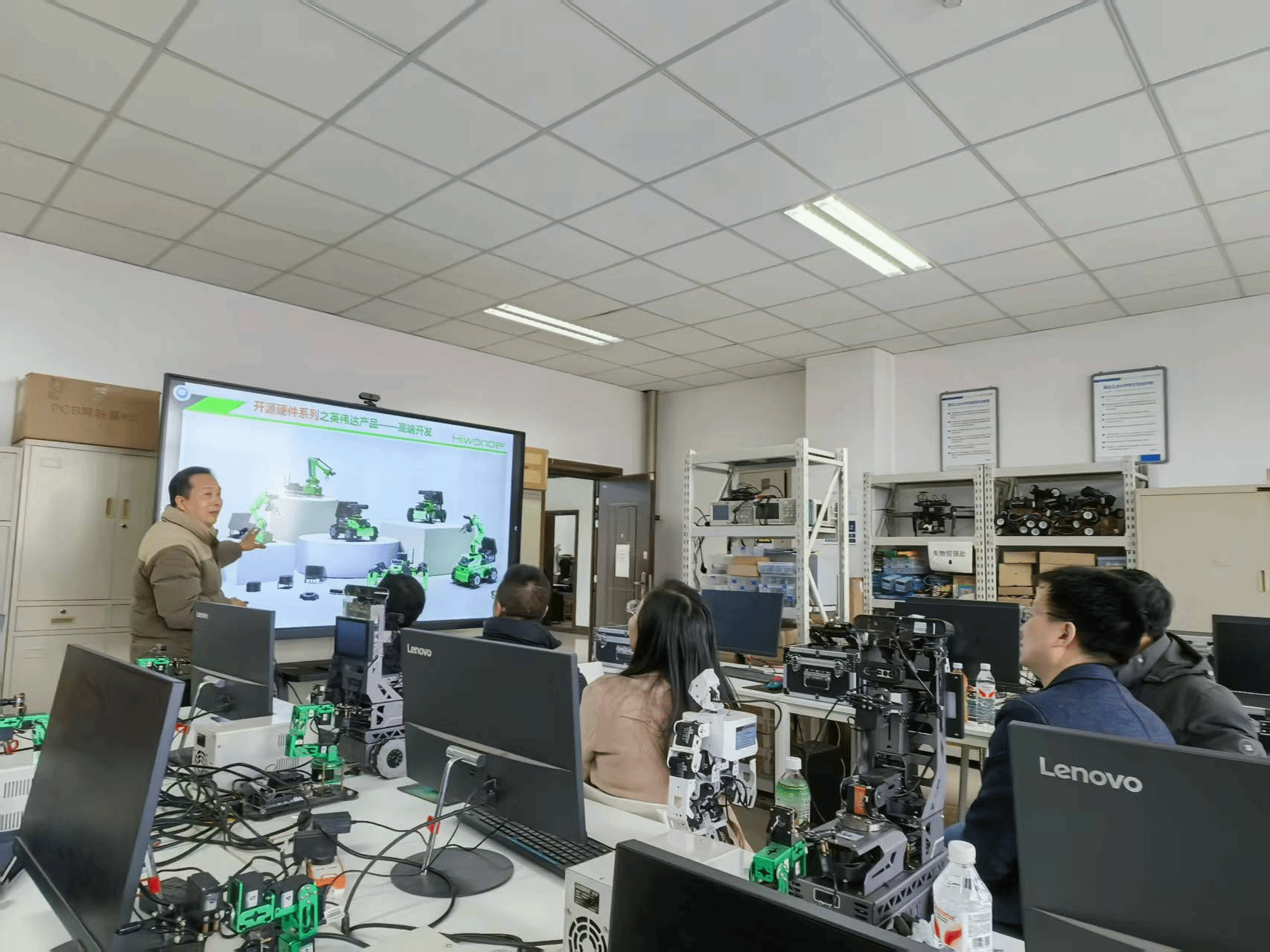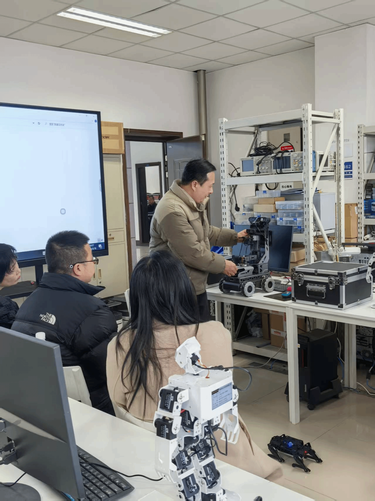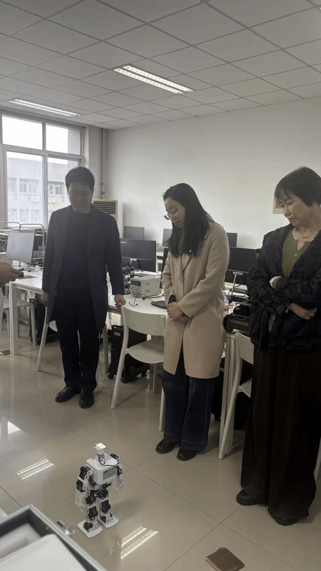 随后,调研团队实地考察了机器人实验室建设及设备运行状态,深入了解实验平台在教学实践、科研创新及学生能力培养中的应用成效。现场展示了机器狗、自动避障小车、人形机器人等智能设备的操作与运行情况。参观过程中,大家对人工智能与机器人技术融合发展的前沿成果有了更为直观深入的认知,为我院机器人实验室建设提供了重要参考,进一步推动相关专业实践教学改革拓展了思路。