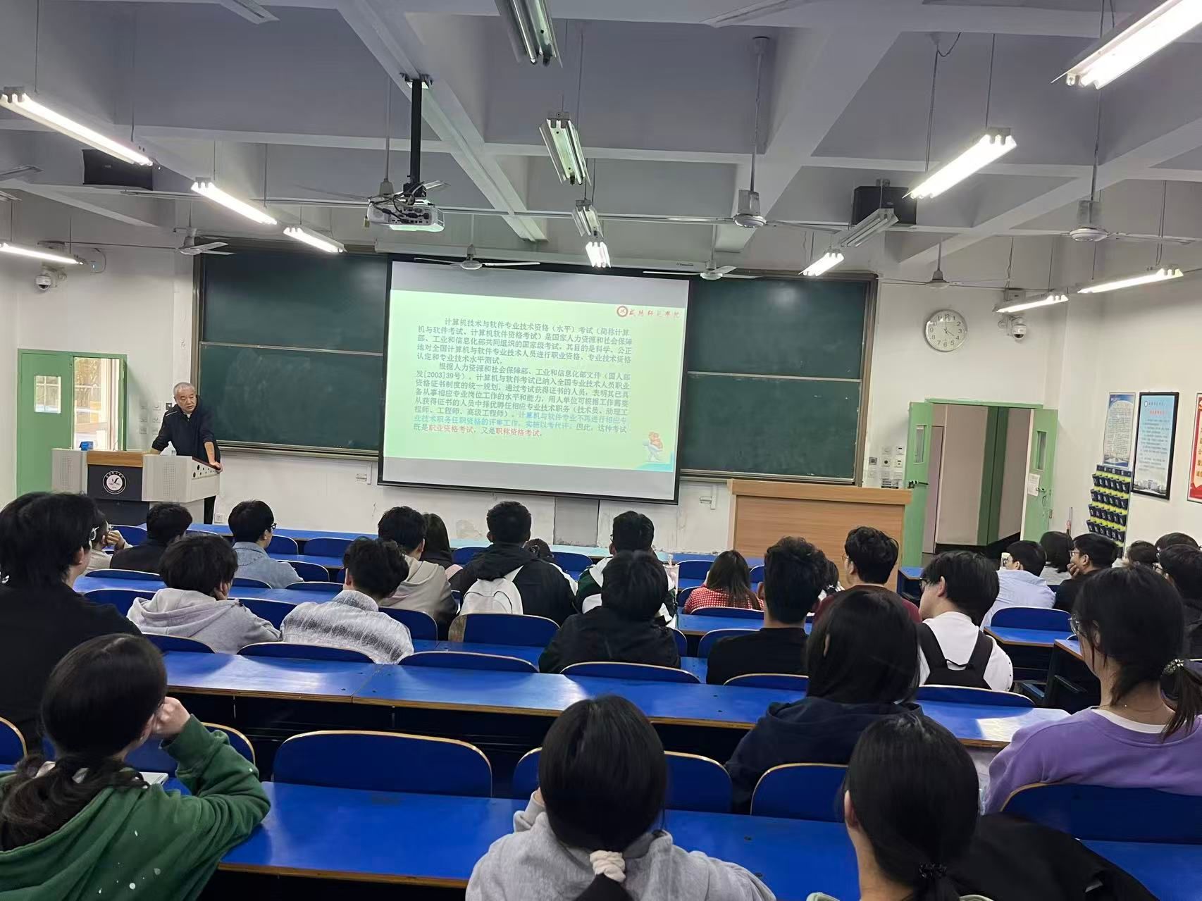 宣讲会上,陈伟老师从软件资格考试的专业能力认证、对职业发展规划、行业规范与技术标准、个人知识体系的完善与更新以及社会认可度与行业影响力几方面进行了详细的阐述,并向学生介绍了软件资格考试的报考指南、备考策略。分享了往届学生的备考经验,解答考试难度、证书含金量等问题,鼓励学生树立信心。